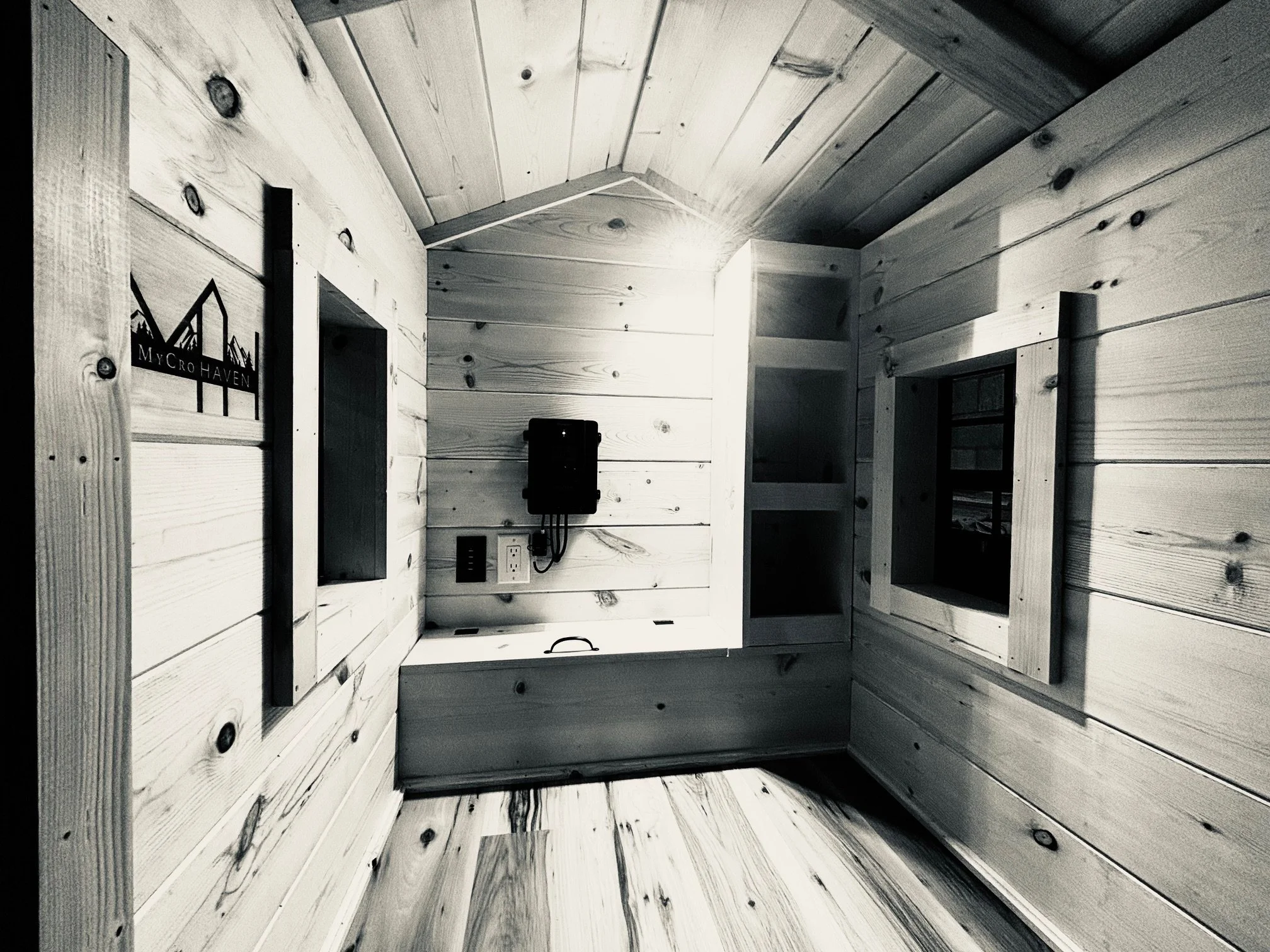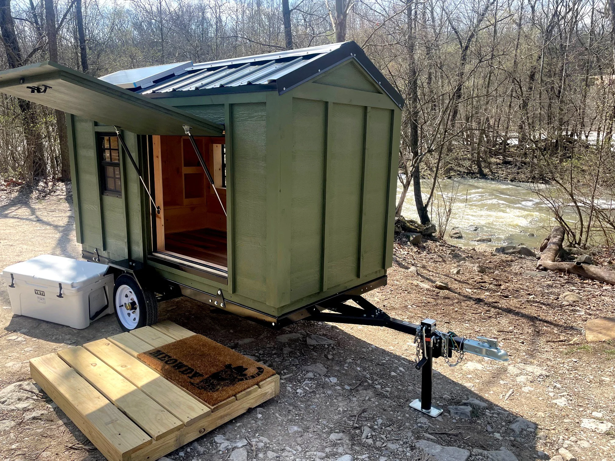 4'x 8' base with 2x4 construction and R-13 insulationLP Smart Side engineered board and batten sidingExterior grade paintTwo 12"x 18" windows with screens3'x 3' door with gas struts and deadboltAsphalt single roof with moisture barrier and drip edgeSolid wood tongue and groove shiplap interiorVinyl waterproof plank flooring120 volt shore power outlet with two interior outlets and 15 amp breaker box